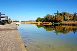 On the eastern side of the area an artificial lake has been created as well as a park area, called Opfikerpark. The artificial lake is 41 metres (135 ft) wide and 550 metres (1,800 ft) long and is safe to swim in, with sandy beaches having been included in the design. Bridges cross the lake at regular intervals to link the inhabited zone with the park.