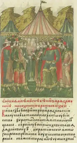 Congress in Isad: Gleb and Konstantin greet the princes. Facial Chronicle, 16th century
