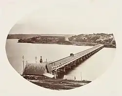 The first Glebe Island Bridge was a private toll-bridge completed in 1862 and was a timber beam viaduct with a small, one arm, hand-cranked swing-span tucked into the Pyrmont shore. After 30 years, this bridge was in need of extensive repairs and the Colonial Government purchased the structure and the Public Works Department (PWD) began planning a replacement bridge.[1] Work on the new Pyrmont Bridge and the bridge across Black Wattle Swamp shortened the travel distance to the inner west suburbs making it easier for produce to be conveyed to the city. A previously un-used part of Johnstons Bay was promoted as the site for a larger abattoir than the others previously used around the closer areas of high water. The new abattoir, to be opened in January 1860, was provided a punt system to cross the short distance to Pyrmont.[3] Work commenced on the first Glebe Island bridge in 1860;[4][5] and the first bridge opened for traffic in 1861.[6]