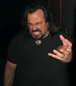 The nature of Benton's 'Satanism' is obscure and a subject of controversy, particularly due to allegations by former Deicide guitarist Eric Hoffman, who dismissed it as insincere and spurious.[22] In early years, Benton was ostensibly a theistic satanist; he implied he had held the belief of the Christian God but worshipped Satan instead.[23] However, Benton's claims are generally considered to have always been tongue-in-cheek, as his purported "Satanism" has since largely been defined as vehement anti-Christian atheism complemented with theatrics suitable for the band.[24] Additionally, Benton has called himself a "showman," and has stated that there is no ideological agenda in Deicide, and that the music is foremost.[25][26] Hence, his beliefs have been questioned by followers of Anton LaVey's Church of Satan, an organization which Benton has denounced as an organized religion.[23] Despite this, Benton claims to be ordained at "several [other] Satanic institutions out there" that do not require a monetary entrance fee. He stated: "I think any organized religion is hokey if you've got to pay to belong. So, I don't know what that makes me."[27]