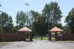 Columns and whole entry complex was remodelled in 1990 following damage to the overhead sign and pillars by heavy and high trucks.[1]