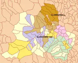Below is a list of the proportions that Glenconkeyne was divided into as part of the survey of 1609, alongside the townlands which comprised those proportions.[3] These names where recited in the grant of the Charter of Londonderry to The Honourable The Irish Society in 1613.[3] Excluding the church lands, the townlands are thus given in the form provided in the Charter of Londonderry with the modern name if known given afterwards in brackets.[1] Not all townlands recorded survived to the present day. All townlands are of one ballyboe in size unless otherwise stated.[3]