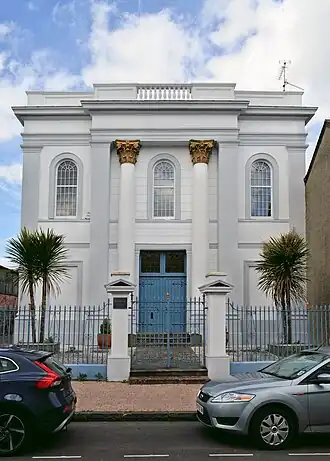The building was constructed in 1843/44 to the design of architect William Armstrong of Bristol. The central bay is defined by giant Corinthian columns in antis. It is a smaller version of the Brunswick Chapel in Bristol, which Armstrong also designed.[4] The building has an impressive neoclassical façade, and memorial windows in stained glass by the Camm Brothers of Smethwick.[5] The building was listed at Grade II* on 27 October 1965[6] and, after near-complete dereliction, was converted into a private house in 2002.[2] Its owner, Anthony Sully, was awarded a substantial grant by Cadw for the conversion, which he designed himself. The project featured on three UK television programmes and won a Civic Trust for Wales award in 2003–4.[7]