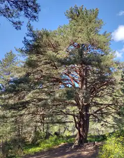 As a Caledonian Forest, the predominant tree species at Glenmore is Scots pine. Around half of the pines originate as a result of natural processes, whilst the remainder have been planted using seeds of local origin. Broadleaved species such as birch, willow and rowan are also present, and there are areas of juniper scrub and alder.[7] Trees are expanding on to areas of open heath, and a natural tree line is developing at the upper edge of the forest. The forest floor is home to many species associated with native pinewoods including one-flowered wintergreen, twinflower, small cranberry and intermediate wintergreen.[14]