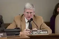 "Everybody knows you're not supposed to smoke!", he wrote.[46] Grothman also voted against the ban on smoking in bars, restaurants and other small business that became effective in July 2010.[47][48][49] After the bill passed, he introduced new legislation to allow lodging establishments, such as hotels, to designate certain rooms as smoking rooms; the bill failed.[50] He also co-sponsored a bill to exempt electronic cigarettes from the smoking ban.[51]