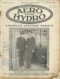 Around this time, Curtiss met retired British naval officer John Cyril Porte, who was looking for a partner to produce an aircraft with him to win the Daily Mail prize for the first transatlantic crossing. In 1912, Curtiss produced the two-seat Flying Fish, a larger craft that became classified as a flying boat because the hull sat in the water; it featured an innovative notch (known as a "step") in the hull that Porte recommended for breaking clear of the water at takeoff. Curtiss correctly surmised that this configuration was more suited to building a larger long-distance craft that could operate from water, and was also more stable when operating from a choppy surface. With the backing of Rodman Wanamaker, Porte and Curtiss produced the America in 1914, a larger flying boat with two engines, for the transatlantic crossing.[38]