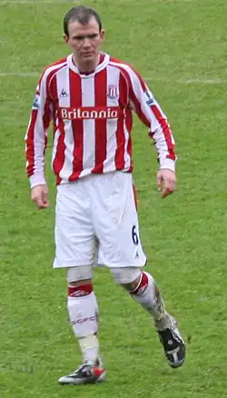 Whelan started the club's first match in the Premier League against Bolton Wanderers.[35] Whelan did not have a good match and as a result he did not feature much in the first team, only playing in League Cup fixtures and even reserve matches.[36] Despite this setback, Whelan was still a regular in the Irish national team. In December 2008 Whelan was being linked with a move away from the Britannia Stadium but he revealed that he wanted to stay.[37] Whelan did manage to force his way back into the first team and he became an important player in Stoke's successful fight for survival. Whelan scored a last minute equaliser away against Aston Villa on 1 March.[38] Whelan signed a new four-year contract with Stoke on 15 September 2009.[39] He scored his first goal of the 2009–10 season against Tottenham Hotspur which earned Stoke a 1–0 victory.[40] He also went on to score against Manchester City in a 1–1 draw with Whelan beating fellow Irish international Shay Given. Arsenal player Aaron Ramsey praised Whelan for his support after Ramsey's suffered a leg break in a match between Stoke and Arsenal.[41]