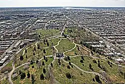 As Glenwood Cemetery began to fill, the unimproved grounds were developed. The layout for Glenwood Cemetery was designed by George F. de la Roche, a civil engineer. De la Roche drew primary inspiration for Glenwood from Green-Wood Cemetery in Brooklyn, New York. But Mount Auburn Cemetery in Boston, Massachusetts, and Laurel Hill Cemetery in Philadelphia, Pennsylvania, were also important to the design. The cemetery hired de la Roche because he proposed a "rural cemetery" landscape design. De la Roche designed a series of winding roadways that followed the topography.[1] A portion of the grounds remained undeveloped by the time the American Civil War broke out. In November 1861, Abraham Lincoln visited Glenwood Cemetery to visit Colonel John Cochrane's First United States Chasseurs (65th New York Regiment).[13] The Lincoln connection to Glenwood Cemetery continued after Lincoln's death, when assassination co-conspirator George Atzerodt was buried in Glenwood.[14]