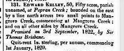 One of the first to be recorded occurred in December 1835 to a James Watkins with the sale of 50 acres at 5 shillings an acre.[6] Land was also promised to Stephen Macdonald and Edward Kelly in 1822 and these grants were formalised in December 1836.[7] Both McDonald and Kelly had occupied their land in the upper reaches of the Popran since the mid 1820s.[8]
