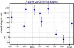 Gliese 402 is a BY Draconis variable, with its apparent magnitude varying between 11.64 and 11.70. The brightness changes are due to starspots and chromospheric activity combined with the rotation of the star. It has been given the variable star designation EE Leonis.[4]