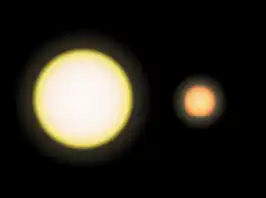 The name Gliese 581 refers to the catalog number from the 1957 survey Gliese Catalogue of Nearby Stars of 965 stars located within 20 parsecs of the Earth. Other names of this star include BD-07° 4003 (BD catalogue, first known publication) and HO Librae (variable star designation). It does not have an individual name such as Sirius or Procyon.[6] The star is a red dwarf with spectral type M3V, located 20.5 light-years away from Earth. It is located about two degrees north of Beta Librae, the brightest star in the Libra constellation. Its mass is estimated to be approximately a third that of the Sun, and it is the 101st closest known star system (including brown dwarfs) to the Sun.[15]