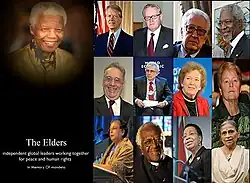 The Elders is an international non-governmental organisation of public figures noted as senior statesmen, peace activists and human rights advocates, who were brought together by former president of South Africa Nelson Mandela in 2007.[3] They describe themselves as "independent global leaders working together for peace, justice, human rights and a sustainable planet". The goal Mandela set for The Elders was to use their "almost 1,000 years of collective experience" to work on solutions for seemingly insurmountable problems such as climate change, HIV/AIDS, and poverty, as well as to "use their political independence to help resolve some of the world's most intractable conflicts".[4]