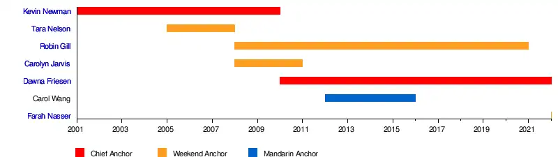 • Kevin Newman (anchor/executive editor, 2001–2010): formerly host of Kevin Newman Live on CTV News Channel and CTV's Question Period