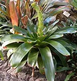 Glomeropitcairnia erectiflora is a plant species in the genus Glomeropitcairnia in the family Bromeliaceae. This epiphytic tank bromeliad species is native to Venezuela and to the island of Trinidad,[1][2] occurring in montane and elfin cloud forests. It is used by tree frog Phytotriades auratus as a refuge and nesting site.[3] The inflorescence can rise 2.7 m (8 ft 10 in) above the rosette of waxy, broad linear leaves.[4]