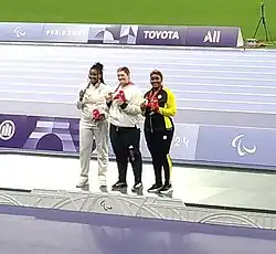![]() Gloria Agblemagnon, Sabrina Fortune, and Poleth Isamar Méndes Sánchez at the F20 shot put medal ceremony at the Paris 2024 Paralympic Games | ||||||||||||||||||||||||||||||