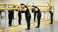 Exercising at a portable barre. A fixed barre can be seen in the background.