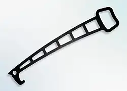 2. A type of heavy-duty "all-weather" descender known as an "abseil rack" or a "rappel rack", consisting of metal bars on a U-shaped chassis, which is frequently used in caving. An alternative heavier device is a "whaletail" (also "whale tail") which is a machined block often used by rescuers.[65]