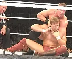 A person accompanying, or "seconding", a wrestler to a match.[44] Typically a manager, valet, enforcer, tag team partner or stablemate, the second is typically listed on the card alongside the wrestler they are supporting. In old school European wrestling, seconds with towels and water service each side as in boxing. They are considered neutral regardless of which corner they serve