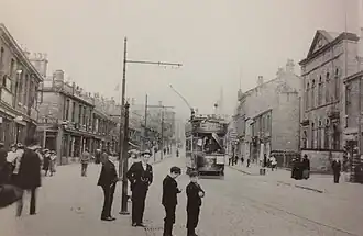 The Glossop Corporation (borough council) had been negotiating with a small number of private companies to exercise its powers to provide electrical lighting and supply since 1898, and an agreement was made with the Urban Electric Supply Company (UESCo) in December 1899.[5] The UESCo was itself a subsidiary of Edmundsons Electricity Corporation, which controlled numerous electricity supply companies across the country, as well as the Scarborough Tramways Company.[6] Edmunsons advised the corporation that, should it wish to establish a tramway in the future, it would be much cheaper to do those works at the same time as the power and lighting supply were installed than to put one in later. They came to an agreement that the UESCo would build, operate and take on the risk of the tramway under similar terms to the electrical contract, and the corporation would authorise the seeking of a provisional order under the Tramways Act 1870, which it did in August 1900. There was an attempted amendment to extend the route into Padfield, which was prevented by a low railway arch at Platt Street, and also an objection from the railway to the tramway passing under Dinting Viaduct, but the order passed its readings in the Lords and Commons.[5] Authority for the tramway was given by the Board of Trade and by Parliament under the Glossop Electric Tramways Order 1901.[4]