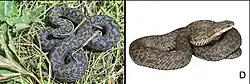 The glacier pit viper can be distinguished from other Asian moccasins by its striped markings as well as its dark zig-zagged marks along its back on its brown-grey or blue-grey base colouring, all on matte scales.[4] It also has a triangular head, common for asian moccasins.[1]