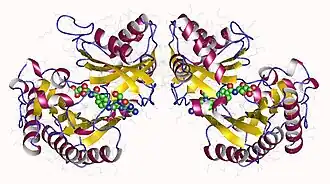- ^ Kohls D, Sulea T, Purisima EO, MacKenzie RE, Vrielink A (January 2000). "The crystal structure of the formiminotransferase domain of formiminotransferase-cyclodeaminase: implications for substrate channeling in a bifunctional enzyme". Structure. 8 (1): 35–46. doi:10.1016/S0969-2126(00)00078-2. PMID 10673422.