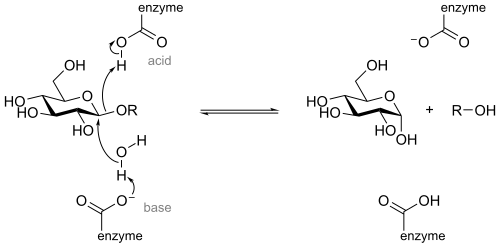 In biochemistry, glycoside hydrolases (also called glycosidases or glycosyl hydrolases) are a class of enzymes which catalyze the hydrolysis of glycosidic bonds in complex sugars.[1][2] They are extremely common enzymes, with roles in nature including degradation of biomass such as cellulose (cellulase), hemicellulose, and starch (amylase), in anti-bacterial defense strategies (e.g., lysozyme), in pathogenesis mechanisms (e.g., viral neuraminidases) and in normal cellular function (e.g., trimming mannosidases involved in N-linked glycoprotein biosynthesis). Together with glycosyltransferases, glycosidases form the major catalytic machinery for the synthesis and breakage of glycosidic bonds.[3]