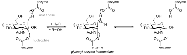 An alternative mechanism for hydrolysis with retention of stereochemistry can occur that proceeds through a nucleophilic residue that is bound to the substrate, rather than being attached to the enzyme. Such mechanisms are common for certain N-acetylhexosaminidases, which have an acetamido group capable of neighboring group participation to form an intermediate oxazoline or oxazolinium ion. This mechanism proceeds in two steps through individual inversions to lead to a net retention of configuration.