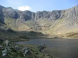 The Glyderau were formed in the Ordovician period about 500 million years ago as the result of two land masses moving together and causing the Snowdonia massif to rise up. Since then, erosion and the advance and retreat of glaciers during the Ice Ages has worn down the mountains to their present proportions. The underlying rock is a mixture of sedimentary and volcanic material. The last ice sheet retreated about 10,000 years ago and Cwm Idwal is a good example of a cirque formed by the ice. The main glacier flowed down the adjoining Nant Ffrancon Valley, a route now followed by the A5 road, and Cwm Idwal housed a side glacier. The ice scarred the surrounding cliffs, hollowed out the bed of Llyn Idwal and dumped rocks and other material that formed moraines at its foot. Massive boulders and shattered rocks crashed down from above to form the boulder fields and screes.[1]