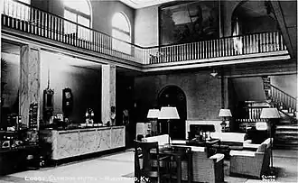 The Glyndon Hotel was rebuilt in 1891. After the fire, the Hotel added some updates such as a side entrance for women, a long porch, and more rooms. The front four-story facade has four bays. Round arches cap the grouped windows on the fourth story. Below, a three-story projection with balconies on each level emphasizes the asymmetrically placed main entrances. White trim consists of latticed balcony railing, Tuscan columns, and window details. Large arches continue the rounded detailing of the exterior into the interior and connect the entrance to the lobby. The Glyndon Hotel also became home to original art, Bert Mullins created a painting of Daniel Boone specifically for the hotel. The hotel also kept a lot of its amenities as the street the hotel sat on was also home to many community staples as it was set next to Cornett Drugs and Boggs Barbershop. The Glyndon Hotel also kept its lavish dinners. During their special Sunday dinner in 1926 food included: Assorted olives, tuna fish canapes, barbequed spring lamb, baked young goose dressing, roast prime ribs of beef, and more. The dining room operated from the hotel's opening until 1965.[5][6]