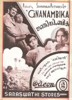Gnanambika is a 1940 Indian Malayalam film, directed by S. Nottani and produced by Annamala Chettiyar.[1] The film stars K. K. Aroor, Alleppey Vincent and Sebastian Kunjukunju Bhagavathar in lead roles.[2] The film had musical score by T. K. Jayarama Iyer.[3]