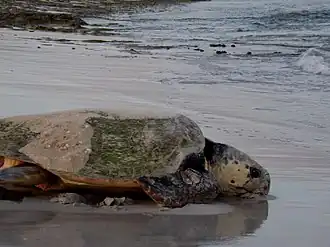 The Western Australian coast is the site of a significant number of rookeries of loggerhead sea turtles (Caretta caretta), green sea turtles (Chelonia mydas), and hawksbill sea turtles (Eretmochelys imbricata), all of which are classified vulnerable to critically endangered on the IUCN Red List of Threatened Species. The nesting sites are particularly numerous for loggerhead sea turtles, whose rookeries range from Shark Bay to Gnaraloo Bay in the south, and Ningaloo Reef to the Cape Range National Park in the north.[3][5][6]