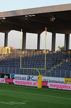In American and Canadian football, there is a scoring area marked at each end of the field called an end zone, and a separate goal post structure.