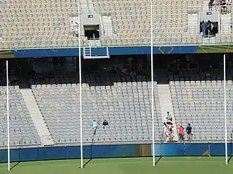 In Australian rules football a goal is scored when the ball is kicked by an attacking player completely between the two tall goal posts. To be awarded a goal, the ball may not contact or pass over the goal post, or touch any player on any part of the body other than the foot or lower leg of an attacker. In such cases, the score is a behind (1 point). The ball may be punted, drop kicked, or kicked off the ground (soccered). The ball may cross the goal line at any height from ground level up and may bounce before crossing the line. A goal scores six points. The behind, which scores one point; is awarded if the ball passes between the point posts or is not awarded a goal by the above provisions when passing through the goal posts.[16] The goal structure consists of two posts at least 6 metres in height and spaced 6.4 metres apart. There is no crossbar and no net.[16]