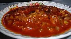 - Vindalho — A spicy curry traditionally made with pork. The name is derived from the Portuguese term for ‘garlic’ and ‘wine’ (“vinho e alho” or “vinha d'alhos”) marinade. Contrary to popular versions made outside Goa, a traditional vindalho does not contain any meat besides pork. It also does not contain any potatoes nor is its name related to the Hindi word ‘āloo’ (potato).[4]