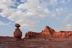Goblin Valley State Park is a state park of Utah, in the United States. The park features thousands of hoodoos, referred to locally as goblins,[3] which are formations of mushroom-shaped rock pinnacles, some as tall as several yards (meters). The distinct shapes of these rocks result from an erosion-resistant layer of rock atop relatively softer sandstone. Goblin Valley State Park and Bryce Canyon National Park, also in Utah about 190 miles (310 km) to the southwest, contain some of the largest occurrences of hoodoos in the world.