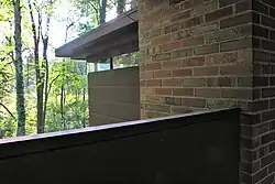 The outer walls are generally made of brick. On some parts of the facade, the brick walls are clad with horizontally-arranged redwood boards, which are separated by battens.[20] When the house was built, the boards were left unpainted so they could be exposed to the elements,[22] but they had been painted in a putty color by the 1990s.[11] There are bands of clerestory windows at the tops of the facade,[20] which were intended to prevent pockets of air from accumulating on the rooms' ceilings.[15] These decorative features were all intended to emphasize the horizontal orientation of the facade.[17][23]
