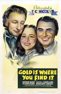 Gold is Where You Find It is a 1938 American Western Technicolor film that gives a fictionalized account of a true event — an ecological disaster whose effects are still felt in California today. Directed by Michael Curtiz and starring George Brent, Olivia de Havilland, and Claude Rains, with a screenplay by Warren Duff and Robert Buckner based on a story by Clements Ripley, the film is set 30 years after the first California Gold Rush, when hydraulic mining sends floods of muddy sludge into the Sacramento Valley, destroying crops and homes, ruining land and water sources and killing people caught in their path. The film highlights the conflict between the mining companies and the wheat farmers by adding a romance between a mining engineer (George Brent) and the daughter (Olivia de Havilland) of a prominent farmer (Claude Rains). She is herself dedicated to the idea that fruit can be raised in the valley. This Technicolor feature film was released on February 12, 1938, by Warner Bros. Pictures.