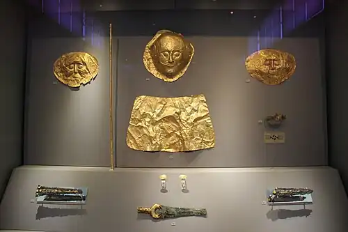 There have been many discoveries of gold grave goods at Grave Circles A and B in the Bronze Age city of Mycenae. Gold has always been used to show status amongst the deceased when used in grave goods. While there's evidence that the practice of grave goods and monumentalizing graves to show status was used throughout Ancient Greece from the Bronze Age and passed through the Classical Period, the goods themselves changed over time. However, using gold as a material was a constant status marker. At the Grave Circles in Mycenae, there were several grave goods found that were made out of gold; masks, cups, swords, jewelry, and more. Because there were so many gold grave goods found at this site there's a legend of Golden Mycenae.[1] Each family group would add ostentatious grave goods to compete with the other family groups for who is the wealthiest. There was more gold found at Grave Circle A and B than in all of Crete before the late Bronze Age.[2]