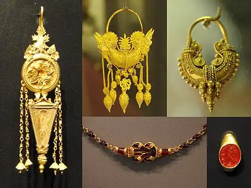 The Gold of Taranto (Ori di Taranto) refers to a collection of jewellery from the Hellenistic and Roman periods. The jewels include gold rings, earrings, and bracelets. The collection is not from a single site or excavation, but several separate finds in the region. It is now in the National Archaeological Museum of Taranto in Italy. The collection has been displayed in various parts of the world.[1]