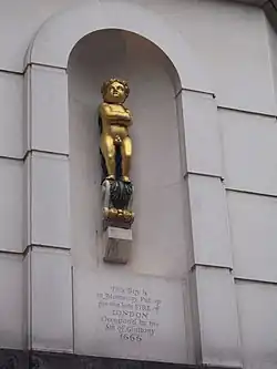 The Golden Boy of Pye Corner is a small late-17th-century monument located on the corner of Giltspur Street and Cock Lane in Smithfield, central London. It marks the spot where the 1666 Great Fire of London was stopped, whereas the Monument indicates the place where it started. The statue of a naked boy is made of wood and is covered with gold; the figure was formerly winged. The late 19th-century building that incorporates it is a Grade II listed building but listed only for the figure.[1]