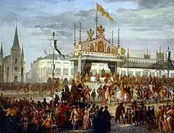 The bull regulated the whole election process in great detail, listing explicitly where, when, and under which circumstances what should be done by whom, not only for the prince-electors but also (for example) for the population of Frankfurt, where the elections were to be held, and also for the counts of the regions the prince-electors had to travel through to get there. The decision to hold the elections in Frankfurt reflected a traditional feeling dating from East Frankish days that both election and coronation ought to take place on Frankish soil.[5] However, the election location was not the only specified location; the bull specified that the coronation would take place in Aachen, and Nuremberg would be the place where the first diet of a reign should be held.[6] The elections were to be concluded within thirty days; failing that, the bull prescribed that the prince-electors were to receive only bread and water until they had decided: