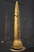 The Golden Cone of Ezelsdorf-Buch (German: Goldblechkegel von Ezelsdorf-Buch) is a Late Bronze Age artefact discovered in 1953 between the villages of Ezelsdorf (Middle Franconia) and Buch (Upper Palatinate) in Southern Germany. A tall (88 cm, 37 inches), cone-shaped object made of thin sheet gold, it is seen as belonging to a group of artifacts referred to as Bronze Age Golden hats. It was presumably worn by special functionaries on ceremonial occasions.