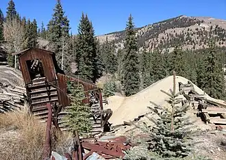 In November 1876, work on the Hotchkiss mine came to an abrupt halt when Enos T. Hotchkiss was severely injured while entering the mine and fell 30 feet down a shaft. After lying idle for many months, the mine was sold at sheriff's sale to Chris Johnson, George E. Wilson (born 1839 in Pennsylvania, first mayor in Sterling, Colorado, died December 21, 1886) and Samuel Wendell. The new owners relocated the ground as the Golden Fleece mine. In 1890, Charles H. Davis took a lease on Golden Fleece mine. Then in 1892, he opened a large vein of rich telluride ore. In July 1892 one carload was valued at more than $19,000. In September 1892 he sold out for $50,000 to George W. Peirce of the Golden Fleece Mining and Milling Company (New York).[4][5][6]