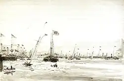 On 23 July, Victoria and the royal family attended a Jubilee Fleet Review at Spithead offshore from Portsmouth. Present were more than one hundred Royal Navy warships and dozens of other vessels. The British fleet included 26 ironclads, 14 cruisers, 31 gunboats and 38 torpedo boats; between them these ships carried 442 guns and were manned by 16,136 officers and ratings. Also present were several foreign warships, as well as troopships, large merchant ships, yachts and numerous small craft filled with spectators. The Queen and other important guests passed along the lines of anchored ships in a flotilla led by the royal yacht, HMY Victoria and Albert. That night, the ships were illuminated by their searchlights. A report for the United States Navy described the review as "the most imposing ever seen afloat".[15]