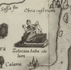 Giles Fletcher in his Of the Russe Common Wealth (1591) writes that some maps and descriptions of countries, e.g., one by Herberstein, mention a "Slata Baba, or the golden hagge", an idol in the shape of an old woman who serves as an oracle for indigenous priests. However Fletcher sees this as a myth. He further writes that in Obdoria, near the mouth of Ob River there is a rock of shape resembling a ragged woman bearing a child in her hands, and Obdorian Samoyeds use it in their pagan sorcery.[3]