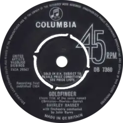 "Goldfinger" is the title song from the 1964 James Bond film of the same name. Composed and arranged by John Barry [3] and with lyrics by Leslie Bricusse and Anthony Newley, the song was performed by Shirley Bassey for the film's opening 6and closing title sequences, as well as the soundtrack album release. The single release of the song gave Bassey her only Billboard Hot 100 top forty hit, peaking in the Top 10 at No. 8 and No. 2 for four weeks on the Adult Contemporary chart,[4] and in the United Kingdom the single reached No. 21 on the UK Singles Chart.[5]