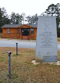 The historical monument in the town reads: "GOLDVILLE / Goldville, Alabama / incorporated on January 25, 1843 / was at one time / one of the / largest cities in Alabama / with a population of / near 5,000 / With the coming of / the California gold rush / in 1849 / the city became / a dormant municipality / later to be / reinstated on July 9, 1973"[3]