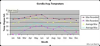 Gondia experiences extreme variations in temperature with very hot summers and very cold winters and has an average relative humidity of 62 per cent. Average recorded rainfall is more than 1,200 mm (47 in) in each rainy season (June to September).