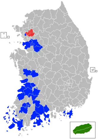 Invocations to Gongsim are particularly widespread among the hereditary shamans of the southwestern provinces of southern Gyeonggi, Chungcheong, Jeolla, and southern South Gyeongsang.[16] This is also the only region where legends about Gongsim have been transcribed.[17] The shamanic practices of this area constitute a coherent cultural tradition not only in the popularity of Gongsim, but in the favored style of shamanic music as well.[16] In this area, the invocation generally begins by referring to "our monarch and ruler" (awang imgeum) or "our sovereign and ruler" (ahwang imgeum), followed by either the statement that Gongsim "makes prostrations" (jeol-hajiyo) or that she "gives to the Buddhist temple" (jeor-e juyo). Namsan is then said to be the "origin" (bon).[18] The following invocations, the first from Naju and the latter from Mokpo, are typical:[18]