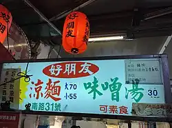 Good Friend Cold Noodles operates at the Shilin Night Market in Taipei's Shilin District. There is indoor seating.[2] The menu includes a noodle dish with a sesame sauce, pickled cucumber, and mustard greens,[3] as well as a Taiwanese-style miso egg drop soup with eggs.[4]